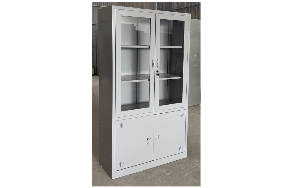 Tủ sắt hồ sơ 4 cánh, 2 khoang, trên có 2 cánh kính 1 khoang, bên trong có 1 đợtDưới 2 cánh sắt 1 khoang bên trong có 1 đợt